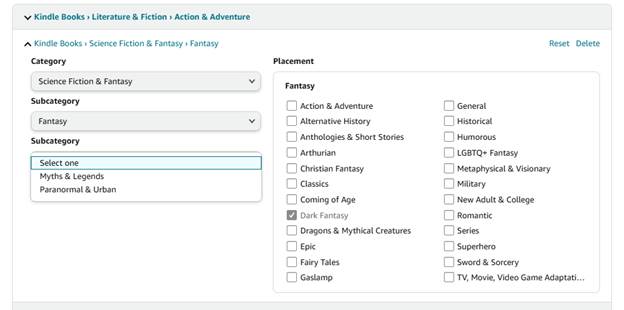 Bueno, en el momento de escribir este post pensaba burlarme de que Amazon solo dividiera Fantasía en las subcategorías de Mitos y Leyendas o Paranormal, pero ahora que veo bien me doy cuenta de que estaba eligiendo una sub-subcategoria, por así decirlo, y ya solo con Fantasy me da a elegir una lista más rica en “Placement”. Sí, al fin puedo marcar Dark Fantasy.