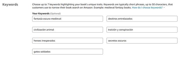 Acabo de leer los consejos que te da el mismo Amazon en este articulo y volví a intentarlo. Busqué ciertas combinaciones de palabras que hablaran de la ambientación de la trama, características de la historia o de los personajes en el buscador de Amazon a ver que devolvían. También me apoyé preguntándole a ChatGPT a ver su opinión con la sinopsis del libro y terminé con la siguiente lista.