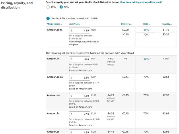 Bueno, que ocurre. Primero hay territorios que no tienen disponibles el plan de 70%. Por ejemplo, si mi libro lo compran desde México o España, tengo mi 70%, si lo compran desde Venezuela o Ecuador, tengo 35% sin importar que. Segundo, tu libro no aplica a 70% si es de dominio público. Y tercero, la opción de 70% te obliga a seguir un rango de precios que puedes ver aquí.